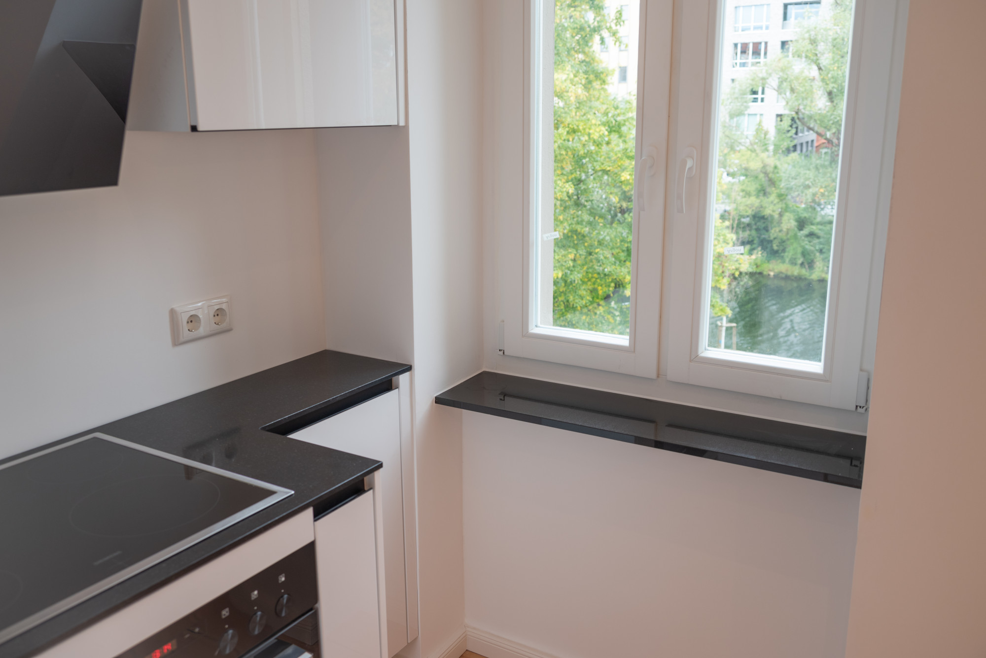 Die Fensterbänke aus Granit unterstreichen die hochwertige Gestaltung. In der Küche glänzt eine Einbauküche mit deutschen Markengeräten und einer robusten Arbeitsplatte aus Naturstein, perfekt ergänzt durch edle schwarze Klinker.